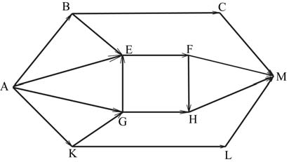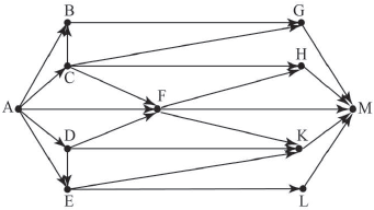 Вопрос id:396805 Тема/шкала: B15-Поиск путей в графе-Поиск количества путей На рисунке – схема дорог, связывающих города A, B, C, E, F, G, H, K, L, M. По каждой дороге можно двигаться только в одном направлении, указанном стрелкой. Сколько существует различных путей из города A в город E?