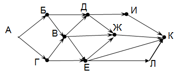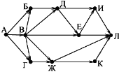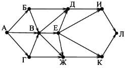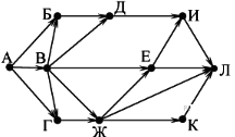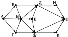 Вопрос id:396807 Тема/шкала: B15-Поиск путей в графе-Поиск количества путей На рисунке – схема дорог, связывающих города А, Б, В, Г, Д, Е, Ж, И, К, Л. По каждой дороге можно двигаться только в одном направлении, указанном стрелкой.