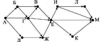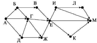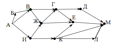 Вопрос id:396810 Тема/шкала: B15-Поиск путей в графе-Поиск количества путей На рисунке – схема дорог, связывающих города А, Б, В, Г, Д, Е, Ж, И, К, Л, М. По каждой дороге можно двигаться только в одном направлении, указанном стрелкой.