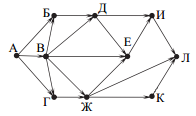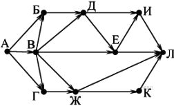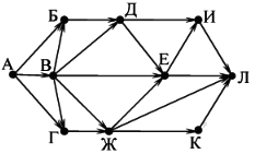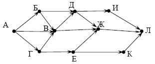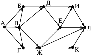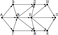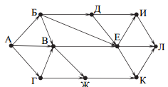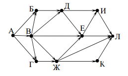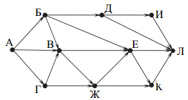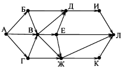 Вопрос id:396852 Тема/шкала: B15-Поиск путей в графе-Поиск количества путей На рисунке — схема дорог, связывающих города А, Б, В, Г, Д, Е, Ж, И, К, Л. По каждой дороге можно двигаться только в одном направлении, указанном стрелкой. Сколько существует различных путей из города А в город Л?