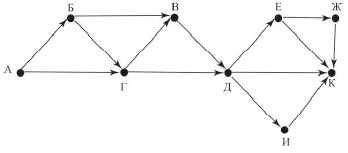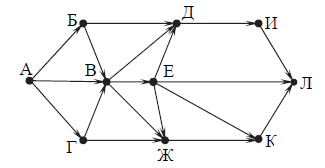 Вопрос id:396839 Тема/шкала: B15-Поиск путей в графе-Поиск количества путей На рисунке — схема дорог, связывающих города А, Б, В, Г, Д, Е, Ж, И, К, Л. По каждой дороге можно двигаться только в одном направлении, указанном стрелкой. Сколько существует различных путей из города А в город Л?