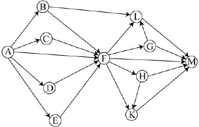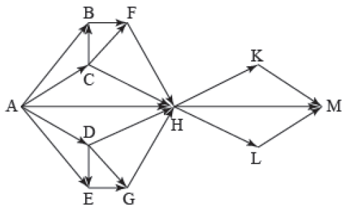 Вопрос id:396850 Тема/шкала: B15-Поиск путей в графе-Поиск количества путей На рисунке изображена схема дорог, связывающих города A, B, C, D, E, F, G, H, K, L, M. По каждой дороге можно двигаться только в одном направлении, указанном стрелкой. Сколько существует различных путей из города A в город M?