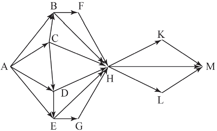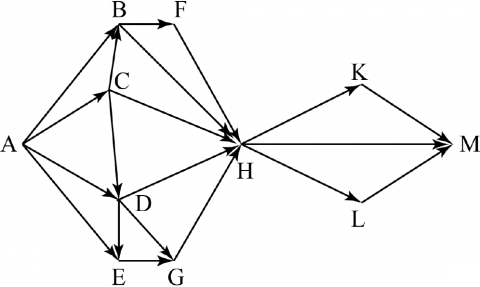 Вопрос id:396851 Тема/шкала: B15-Поиск путей в графе-Поиск количества путей На рисунке изображена схема дорог, связывающих города A, B, C, D, E, F, G, H, K, L, M. По каждой дороге можно двигаться только в одном направлении, указанном стрелкой. Сколько существует различных путей из города A в город M?