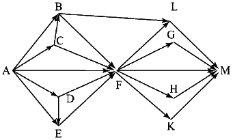Вопрос id:396821 Тема/шкала: B15-Поиск путей в графе-Поиск количества путей На рисунке - схема дорог, связывающих города А, В, С, D, Е, F, G, Н, К, L, М. По каждой дороге можно двигаться только в одном направлении, указанном стрелкой. Сколько существует различных путей из города А в город М?