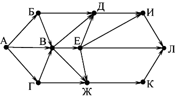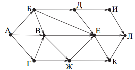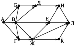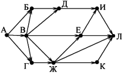 Вопрос id:396834 Тема/шкала: B15-Поиск путей в графе-Поиск количества путей На рисунке — схема дорог, связывающих города А, Б, В, Г, Д, Е, Ж, И, К, Л. По каждой дороге можно двигаться только в одном направлении, указанном стрелкой. Сколько существует различных путей из города А в город Л?