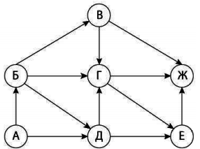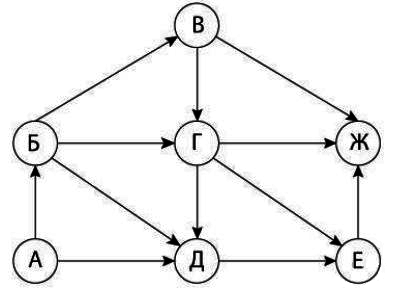 Вопрос id:396837 Тема/шкала: B15-Поиск путей в графе-Поиск количества путей На рисунке — схема дорог, связывающих города А, Б, В, Г, Д, Е, Ж. По каждой дороге можно двигаться только в одном направлении, указанном стрелкой. Сколько существует различных путей из города А в город Ж?