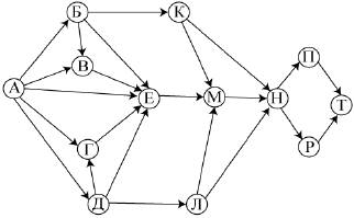 Вопрос id:396857 Тема/шкала: B15-Поиск путей в графе-Поиск количества путей На рисунке – схема дорог, связывающих города А, Б, В, Г, Д, Е, К, Л, М, Н, П, Р, Т. По каждой дороге можно двигаться только в одном направлении, указанном стрелкой. Сколько существует различных путей из города А в город Т?