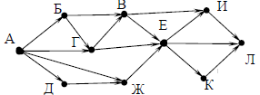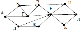 Вопрос id:396856 Тема/шкала: B15-Поиск путей в графе-Поиск количества путей На рисунке – схема дорог, связывающих города А, Б, В, Г, Д, Е, Ж, И, К, Л. По каждой дороге можно двигаться только в одном направлении, указанном стрелкой. Сколько существует различных путей из города А в город Л?