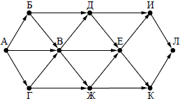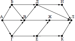 Вопрос id:396858 Тема/шкала: B15-Поиск путей в графе-Поиск количества путей На рисунке — схема дорог, связывающих города А, Б, В, Г, Д, Е, Ж, И, К, Л. По каждой дороге можно двигаться только в одном направлении, указанном стрелкой. Сколько существует различных путей из города А в город Л?