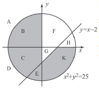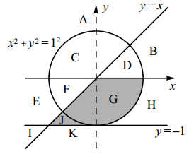 1. Перерисуйте и заполните таблицу, которая показывает, как работает программа при аргументах, принадлежащих различным областям (A, B, C, D, E, F, G, H, I). Точки, лежащие на границах областей, отдельно не рассматривать. Координатные оси не являются границами областей. В столбцах условий укажите «да», если условие выполнится, «нет», если условие не выполнится, «—» (прочерк), если условие не будет проверяться, «не изв.», если программа ведёт себя по-разному для разных значений, принадлежащих данной области. В столбце «Программа выведет» укажите, что программа выведет на экран. Если программа ничего не выводит, напишите «—» (прочерк). Если для разных значений, принадлежащих области, будут выведены разные тексты, напишите «не изв.». В последнем столбце укажите «да» или «нет».