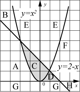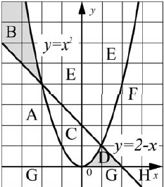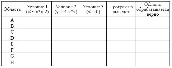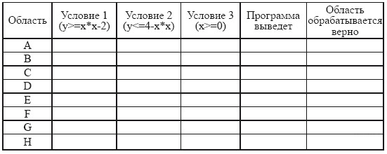 Последовательно выполните следующее. 1. Перерисуйте и заполните таблицу, которая показывает, как работает программа при аргументах, принадлежащих различным областям (A, B, C, D, E, F, G и H). Точки, лежащие на границах областей, отдельно не рассматривать. В столбцах условий укажите "да", если условие выполнится, "нет", если условие не выполнится, "—" (прочерк), если условие не будет проверяться, "не изв.", если программа ведет себя по-разному для разных значений, принадлежащих данной области. В столбце "Программа выведет" укажите, что программа выведет на экран. Если программа ничего не выводит, напишите "—" (прочерк). Если для разных значений, принадлежащих области, будут выведены разные тексты, напишите "не изв". В последнем столбце укажите "да" или "нет".