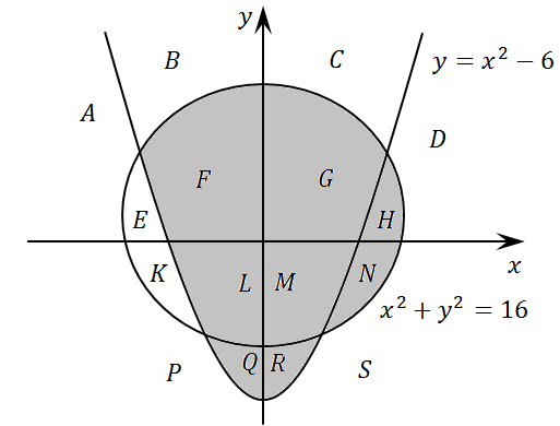 Область - часть плоскости, которой принадлежит проверяемая точка. (Все возможные области отмечены на рисунке буквами А, В, С, ... S.)