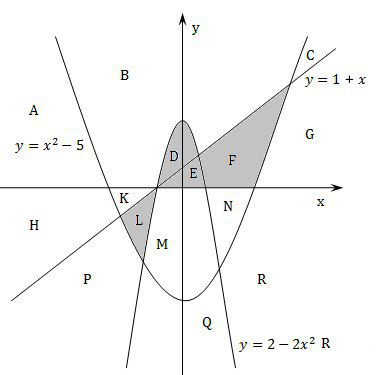 1. Перерисуйте и заполните таблицу, которая показывает, как работает программа при аргументах, принадлежащих различным областям (A, B, C, D, E и F). Точки, лежащие на границах областей, отдельно не рассматривать. В столбцах условий укажите "да", если условие выполнится, "нет", если условие не выполнится, "—" (прочерк), если условие не будет проверяться, "не изв.", если программа ведет себя по-разному для разных значений, принадлежащих данной области. В столбце "Программа выведет" укажите, что программа выведет на экран. Если программа ничего не выводит, напишите "—" (прочерк). Если для разных значений, принадлежащих области, будут выведены разные тексты, напишите "не изв". В последнем столбце укажите "да" или "нет".