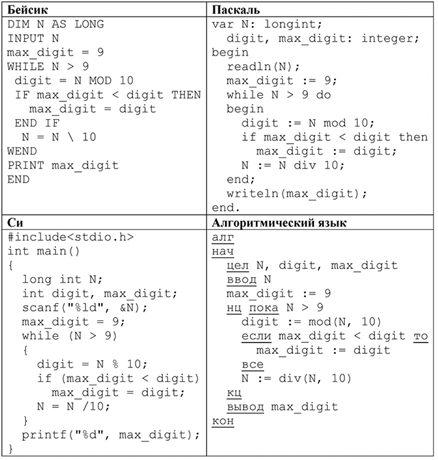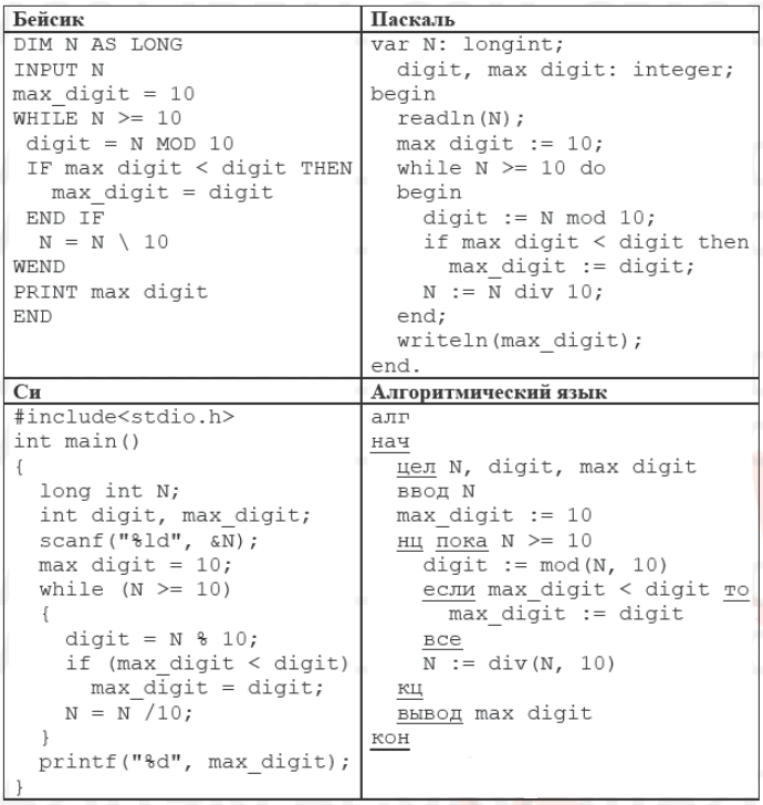2. Укажите, как нужно доработать программу, чтобы не было случаев её неправильной работы. (Это можно сделать несколькими способами, достаточно указать любой способ доработки исходной программы.) Вопрос id:397685 Тема/шкала: С1-Поиск и исправление ошибок в программе-Координатная плоскость Требовалось написать программу, при выполнении которой с клавиатуры считывается натуральное число N, не превосходящее 109, и выводится максимальная цифра этого числа. Программист торопился и написал программу неправильно. (Ниже для Вашего удобства программа представлена на четырёх языках программирования.)