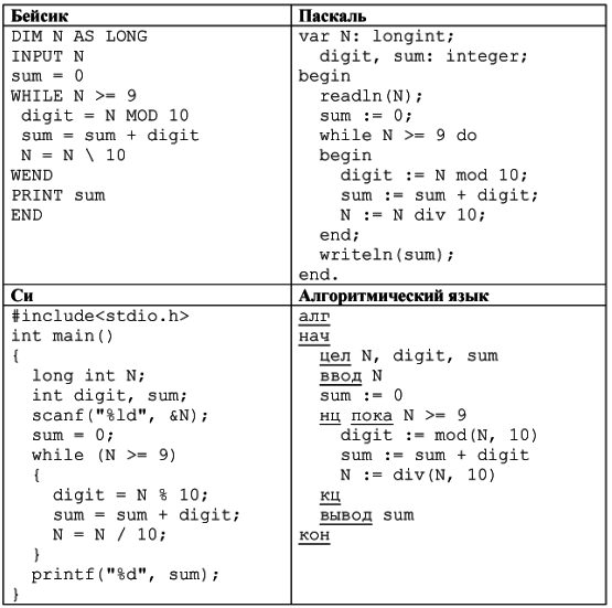Обратите внимание, что требуется найти ошибки в имеющейся программе, а не написать свою, возможно, использующую другой алгоритм решения. Исправление ошибки должно затрагивать только строку, в которой находится ошибка. Вопрос id:397704 Тема/шкала: С1-Поиск и исправление ошибок в программе-Работа с числами Требовалось написать программу, при выполнении которой с клавиатуры считывается натуральное число N, не превосходящее 109, и выводится сумма цифр этого числа. Программист торопился и написал программу неправильно. (Ниже для Вашего удобства программа представлена на четырёх языках программирования.)