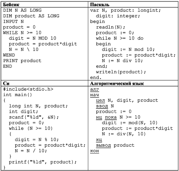 3. Укажите одно число для которого эта программа будет работать верно. Вопрос id:397705 Тема/шкала: С1-Поиск и исправление ошибок в программе-Работа с числами Требовалось написать программу, при выполнении которой с клавиатуры считывается натуральное число N, не превосходящее 109, и выводится произведение цифр этого числа. Программист торопился и написал программу неправильно. (Ниже для Вашего удобства программа представлена на четырёх языках программирования.)