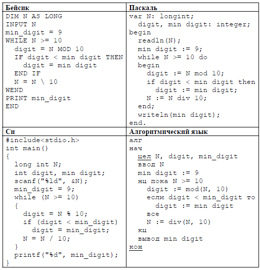 Для каждой ошибки выпишите строку, в которой она допущена, и приведите эту же строку в исправленном виде. Обратите внимание: вам нужно исправить приведённую программу, а не написать свою. Вы можете только заменять ошибочные строки, но не можете удалять строки или добавлять новые. Заменять следует только ошибочные строки: за исправления, внесённые в строки, не содержащие ошибок, баллы будут снижаться. Вопрос id:397715 Тема/шкала: С1-Поиск и исправление ошибок в программе-Работа с числами Требовалось написать программу, при выполнении которой с клавиатуры считывается натуральное число N, не превосходящее 109, и выводится минимальная цифра этого числа. Программист торопился и написал программу неправильно. (Ниже для Вашего удобства программа представлена на четырёх языках программирования.)