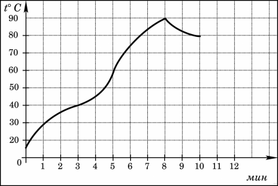 Вопрос id:398089 Тема/шкала: B11-Чтение графиков и диаграмм-Определение величины по графику На графике показан процесс разогрева двигателя легкового автомобиля. На оси абсцисс откладывается время в минутах, прошедшее от запуска двигателя, на оси ординат температура двигателя в градусах Цельсия. Определите по графику, сколько минут двигатель нагревался от температуры 60 °C до температуры 90 °C.