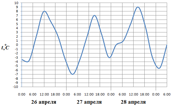 Вопрос id:398091 Тема/шкала: B11-Чтение графиков и диаграмм-Определение величины по графику На рисунке показано изменение температуры воздуха на протяжении трех суток. По горизонтали указывается дата и время суток, по вертикали — значение температуры в градусах Цельсия. Определите по рисунку наименьшую температуру воздуха 27 апреля. Ответ дайте в градусах Цельсия.