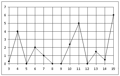 Вопрос id:398092 Тема/шкала: B11-Чтение графиков и диаграмм-Определение величины по графику На рисунке жирными точками показано суточное количество осадков, выпадавших в Казани с 3 по 15 февраля 1909 года. По горизонтали указываются числа месяца, по вертикали — количество осадков, выпавших в соответствующий день, в миллиметрах. Для наглядности жирные точки на рисунке соединены линией. Определите по рисунку, какого числа впервые выпало