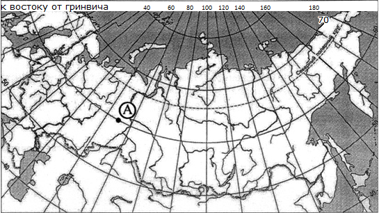 ?) 70º с.ш. 60º з.д. ?) 70º с.ш. 60º в.д. ?) 60º с.ш. 70º з.д. ?) 60º с.ш. 70º в.д. Вопрос id:413069 Тема/шкала: 01.Географические модели. Карта и план местности Какие географические координаты имеет точка, обозначенная на карте России буквой А?