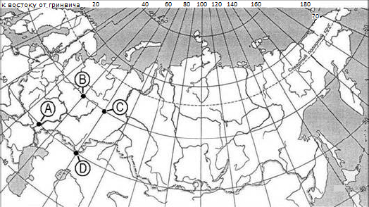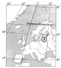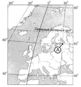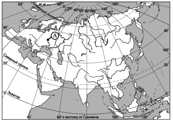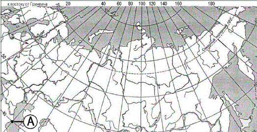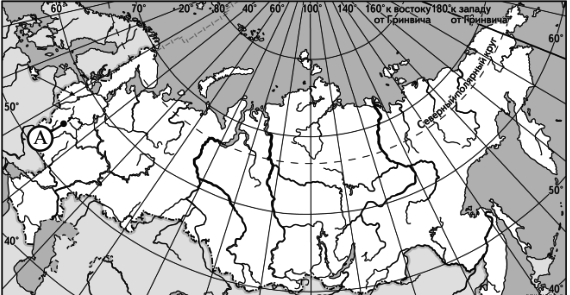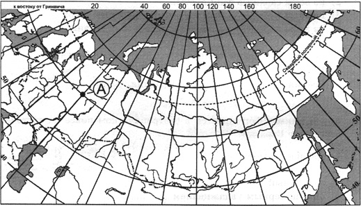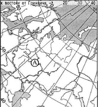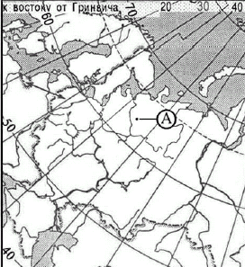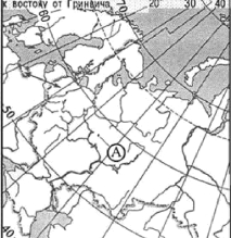 ?) 30° с.ш. и 60° в.д. ?) 60° с.ш. и 30° в.д. ?) 60° с.ш. и 30° з.д. ?) 30° с.ш. и 60° з.д. Вопрос id:413046 Тема/шкала: 01.Географические модели. Карта и план местности Какие географические координаты имеет точка, обозначенная на карте России буквой А?