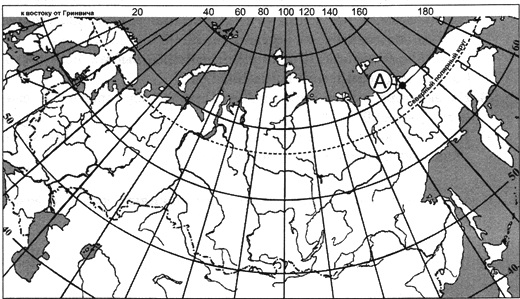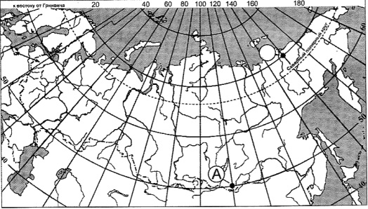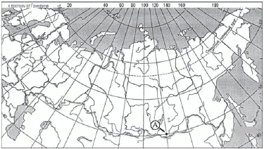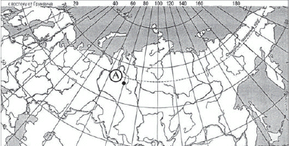 ?) 55º с. ш. 120º в. д. ?) 55º с. ш. 120º з. д. ?) 65º с. ш. 120º з. д. ?) 65º с. ш. 120º в. д. Вопрос id:413068 Тема/шкала: 01.Географические модели. Карта и план местности Какие географические координаты имеет точка, обозначенная на карте России буквой А?