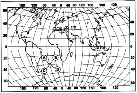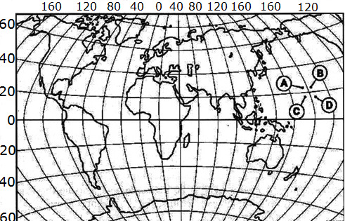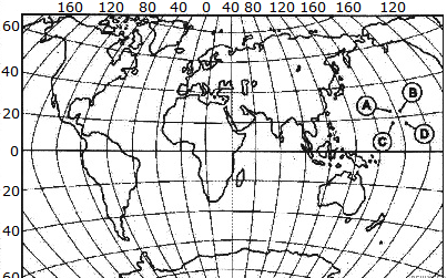 ?) A ?) D ?) B ?) C Вопрос id:413025 Тема/шкала: 01.Географические модели. Карта и план местности Какой буквой на карте мира обозначена точка, имеющая координаты 24° с.ш. и 176° в.д.?