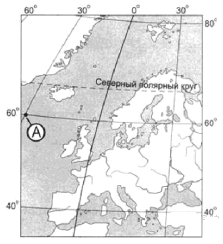 ?) 60° с.ш. 45° з.д. ?) 45° с.ш. 60° з.д. ?) 60° с.ш. 45° в.д. ?) 45° с.ш. 60° в.д. |
