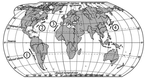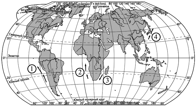 Вопрос id:413524 Тема/шкала: 07.Мировой океан и его части. Воды суши Установите соответствие между океаническим течением и его обозначением на карте.