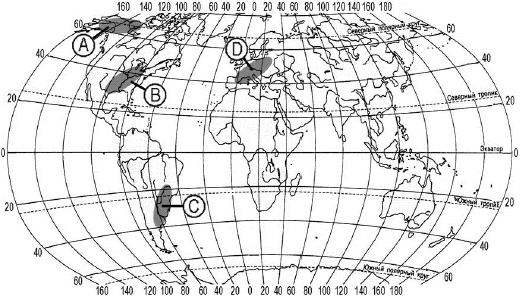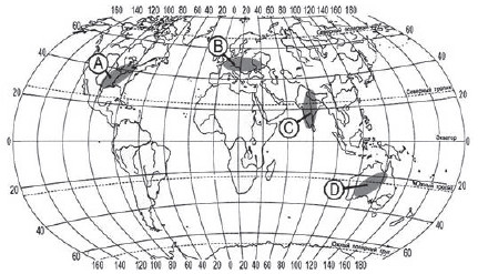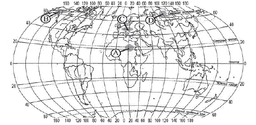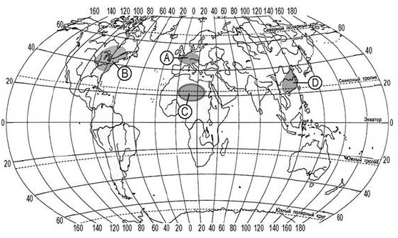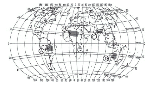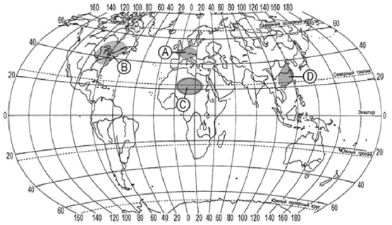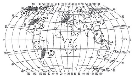 ?) B ?) C ?) А ?) D Вопрос id:413701 Тема/шкала: 10.Географические особенности размещения населения В пределах какой из территорий, обозначенных буквами на карте, средняя плотность населения наименьшая?