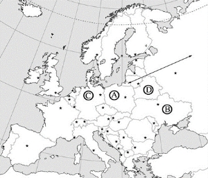 ?) Индия ?) Германия ?) Россия ?) Австралия Вопрос id:413921 Тема/шкала: B14-Современная политическая карта мира Какой буквой на карте обозначена территория Германии?