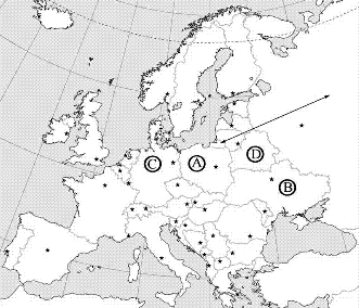 ?) B ?) A ?) D ?) C Вопрос id:413953 Тема/шкала: B14-Современная политическая карта мира Какой буквой на карте обозначена территория государства Польша?