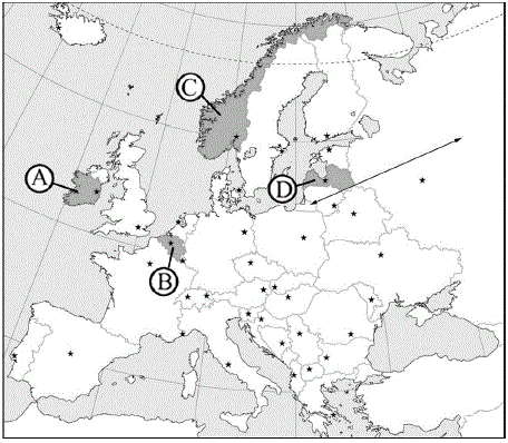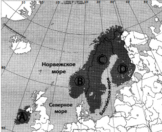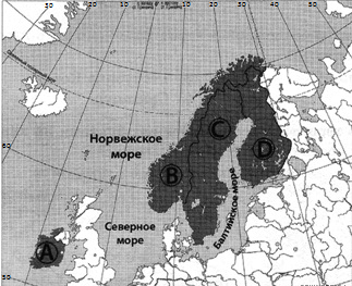?) D ?) A ?) C ?) B Вопрос id:413926 Тема/шкала: B14-Современная политическая карта мира Какой буквой на фрагменте политической карты зарубежной Европы обозначено государство Швеция?