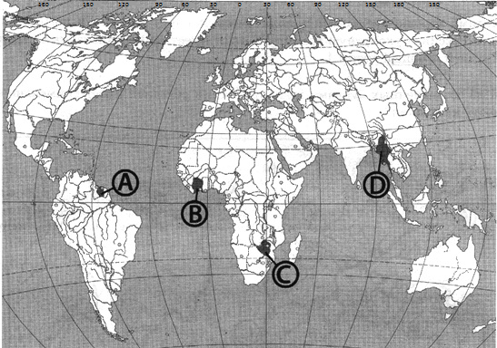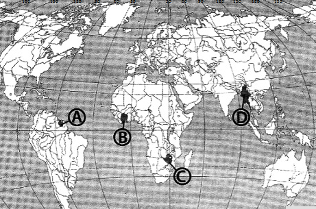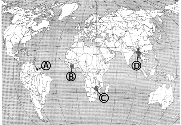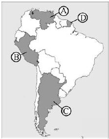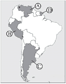 ?) А ?) C ?) B ?) D Вопрос id:413941 Тема/шкала: B14-Современная политическая карта мира Какой буквой на карте обозначено государство Венесуэла?