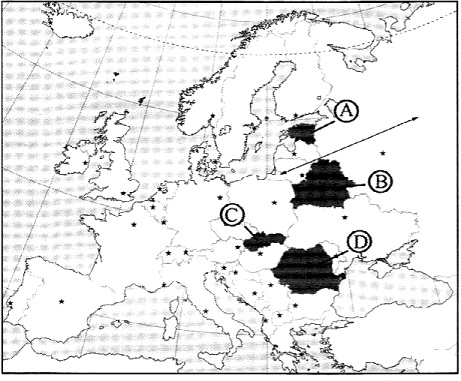 ?) A ?) C ?) B ?) D Вопрос id:413925 Тема/шкала: B14-Современная политическая карта мира Какой буквой на карте обозначено государство Белоруссия?