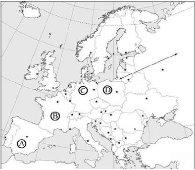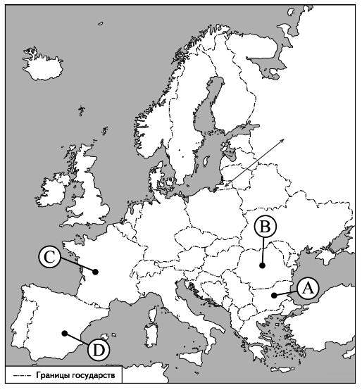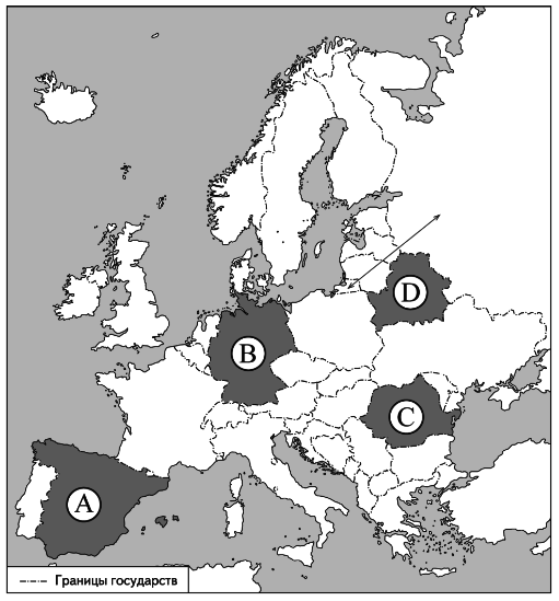 ?) A ?) C ?) D ?) B Вопрос id:413968 Тема/шкала: B14-Современная политическая карта мира Какой буквой на карте Европы обозначена территория государства Испания?