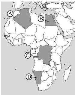 ?) B ?) C ?) A ?) D Вопрос id:413944 Тема/шкала: B14-Современная политическая карта мира Какой буквой на карте обозначен Алжир?