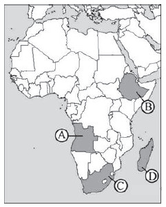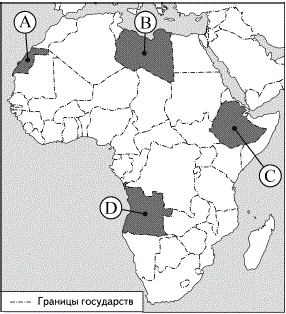 ?) B ?) А ?) D ?) С Вопрос id:413964 Тема/шкала: B14-Современная политическая карта мира Какой буквой на карте Африки обозначена территория государства Ангола?