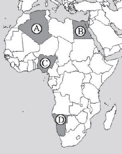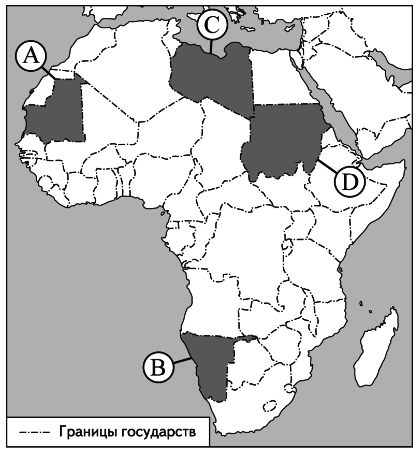 ?) C ?) B ?) A ?) D Вопрос id:413971 Тема/шкала: B14-Современная политическая карта мира Какой буквой на карте Африки обозначена территория государства Ливия?