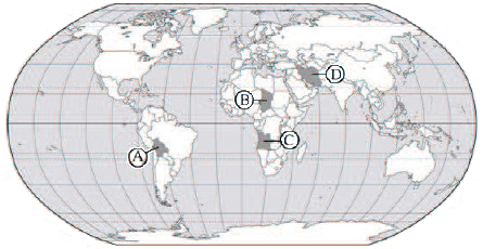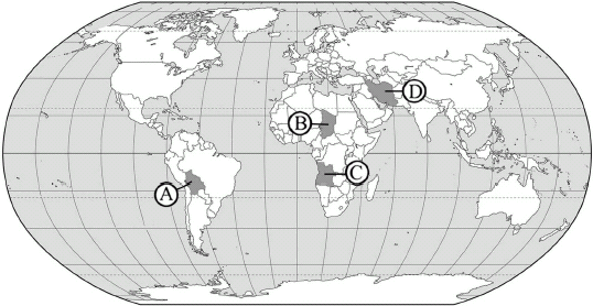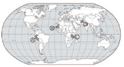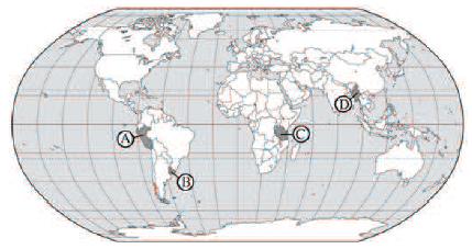 ?) А ?) С ?) В ?) D Вопрос id:413956 Тема/шкала: B14-Современная политическая карта мира Какой буквой на картосхеме обозначено государство Перу?