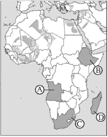 ?) D ?) C ?) A ?) B Вопрос id:413951 Тема/шкала: B14-Современная политическая карта мира Какой буквой на карте обозначена территория государства Ангола?