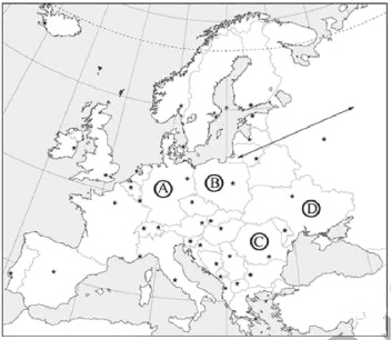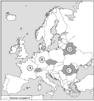 ?) А ?) D ?) С ?) В Вопрос id:413969 Тема/шкала: B14-Современная политическая карта мира Какой буквой на карте Европы обозначена территория государства Румыния?