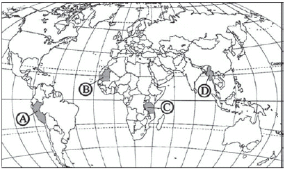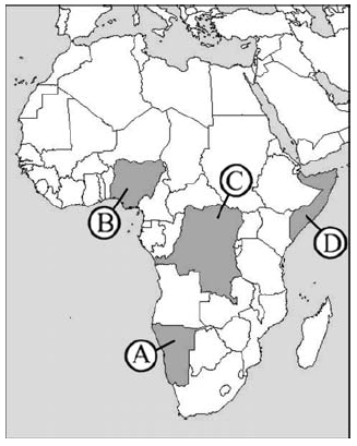 ?) D ?) C ?) A ?) B Вопрос id:413950 Тема/шкала: B14-Современная политическая карта мира Какой буквой на карте обозначена территория государства Нигерия?