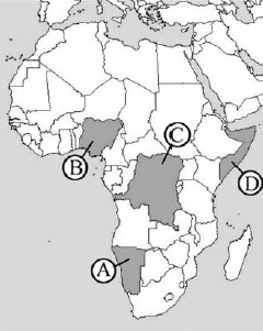 ?) А ?) D ?) С ?) B Вопрос id:413966 Тема/шкала: B14-Современная политическая карта мира Какой буквой на картосхеме Африки обозначено государство ДР Конго?
