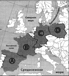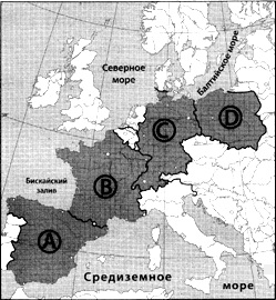 ?) A ?) B ?) D ?) C Вопрос id:413923 Тема/шкала: B14-Современная политическая карта мира Какой буквой на карте Европы обозначена Германия?