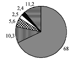 ?) площади пашни ?) площади лесов ?) поголовью крупного рогатого скота ?) производству минеральных удобрений Вопрос id:414457 Тема/шкала: B21-Россия в современном мире На диаграмме, отражающей структуру экспорта Российской Федерации в 2011 г. (в %), условным знаком
