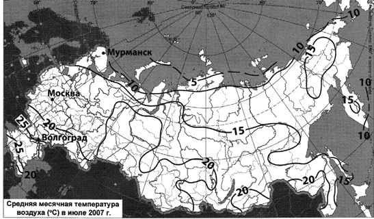 А) Казань Б) Братск В) Нижневартовск Вопрос id:414623 Тема/шкала: 17.Погода и климат. Распределение тепла и влаги на Земле С помощью карты сравните средние июльские температуры в городах Мурманск, Москва и Волгоград. Расположите эти города в порядке увеличения средней июльской температуры.