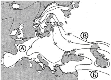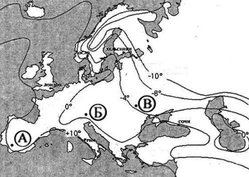 Средние температуры января на территории Европы Вопрос id:414621 Тема/шкала: 17.Погода и климат. Распределение тепла и влаги на Земле С помощью приведенной ниже карты сравните средние температуры января в точках, обозначенных на карте буквами А, Б, В. Расположите эти точки в порядке повышения средней температуры января в данных точках.
