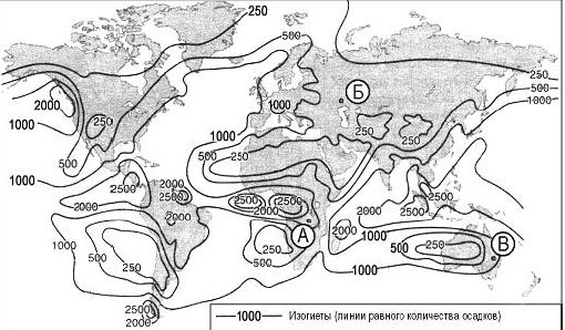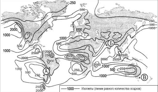 A) А Б) Б B) В Вопрос id:414625 Тема/шкала: 17.Погода и климат. Распределение тепла и влаги на Земле С помощью карты сравните среднегодовое количество атмосферных осадков в точках, обозначенных на карте буквами А, Б, В. Расположите эти точки в порядке увеличения количества осадков, выпадающих в них.